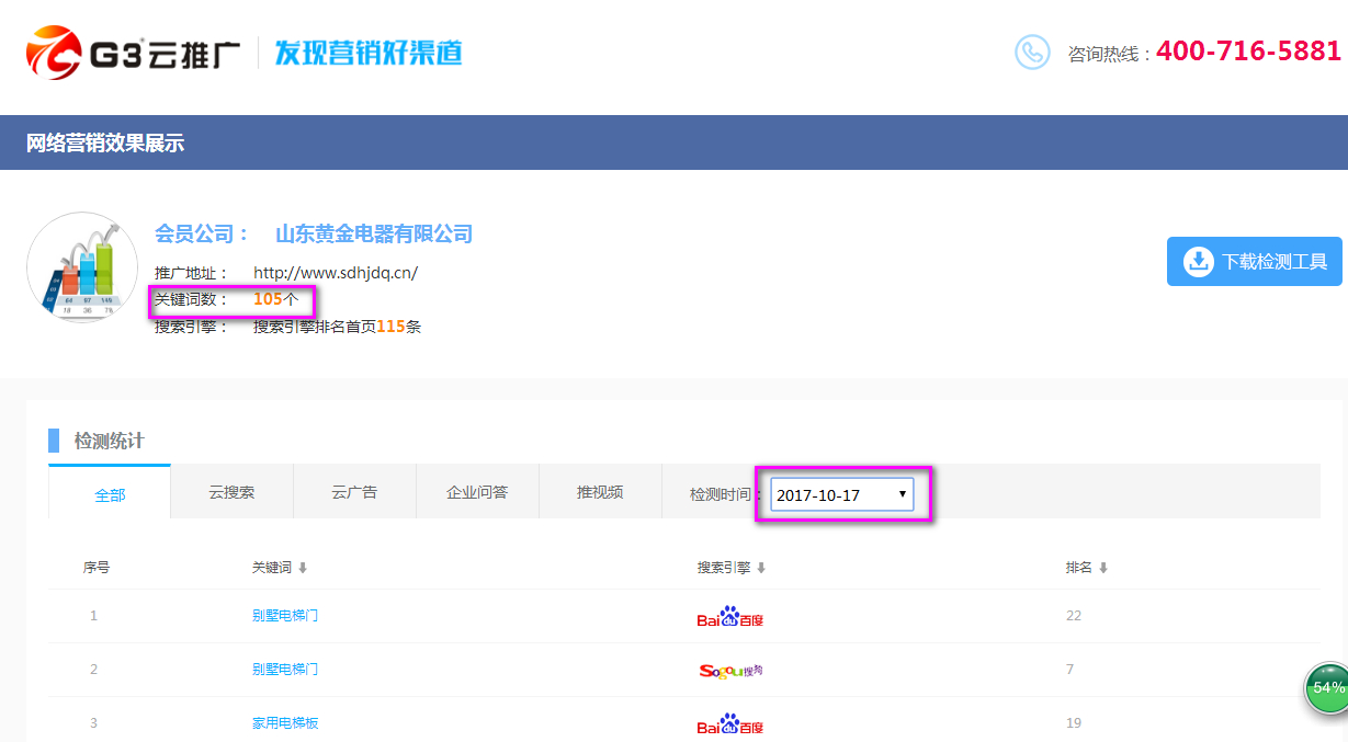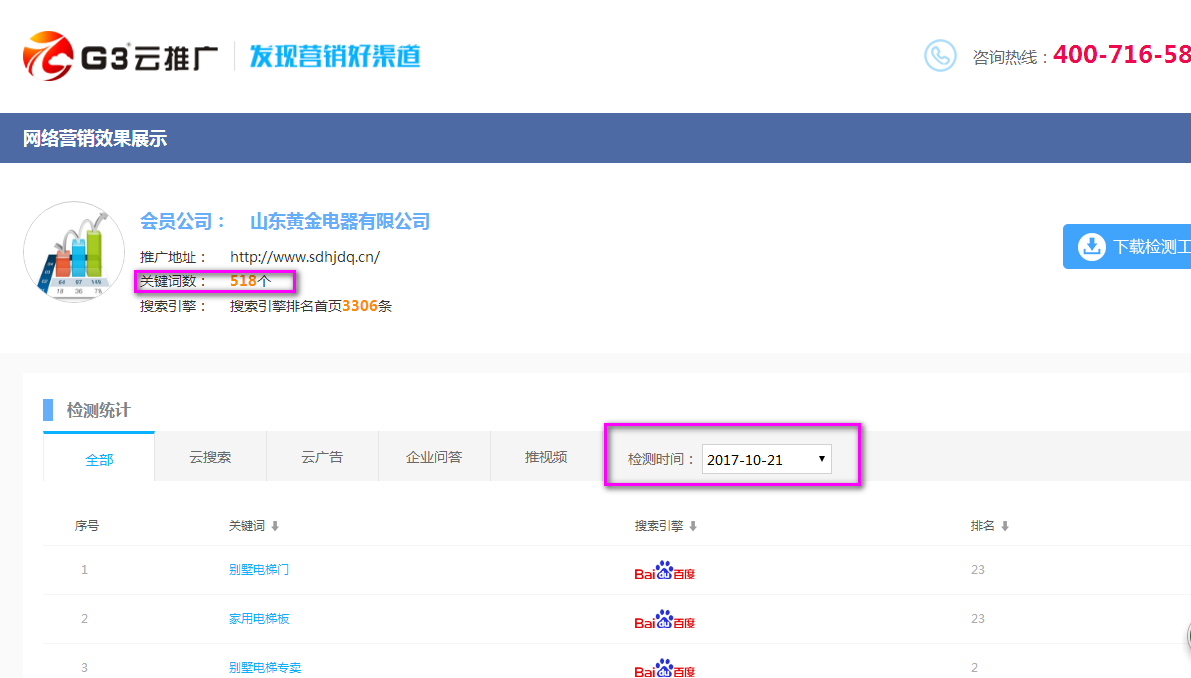 一個周之后518個關鍵詞,試問除了“G3云推廣”還有哪個產品能做到在短短的一個周的時間518個關鍵詞?心動不如行動,關于“G3云推廣”更多的信息歡迎您來電咨詢。