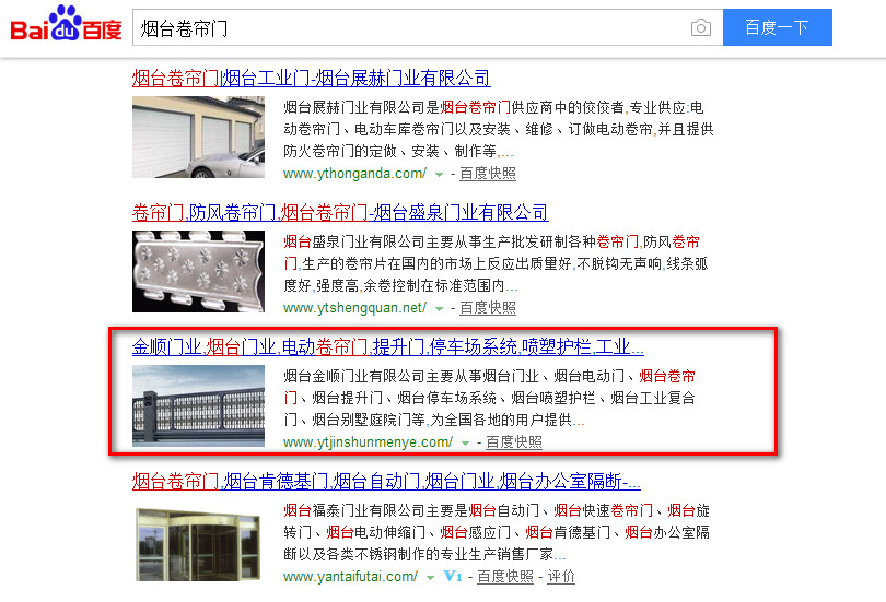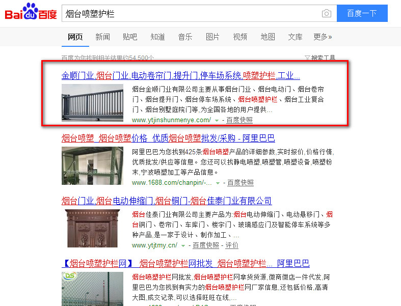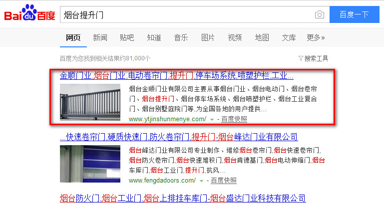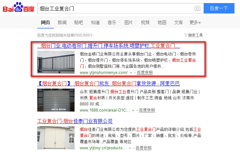 煙臺(tái)智聯(lián)網(wǎng)絡(luò)小編為您展示我們做的:煙臺(tái)門業(yè)、煙臺(tái)提升門、煙臺(tái)卷簾門、煙臺(tái)噴塑護(hù)欄、煙臺(tái)工業(yè)復(fù)合門等關(guān)鍵詞首頁排名案例。