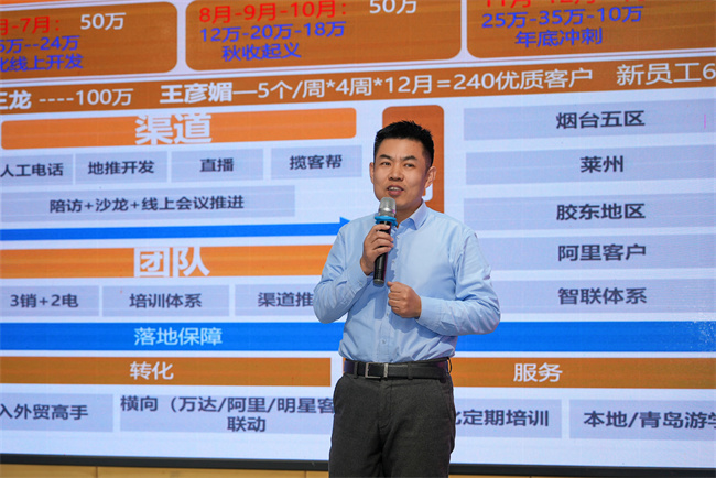 開發(fā)區(qū)分公司總經(jīng)理王龍,在會議上表達(dá)了25年整體的公司發(fā)展方向、新客戶開發(fā)模式、銷售人員的工作流程、每個開發(fā)區(qū)員工的目標(biāo)任務(wù),明確目標(biāo)奮力向前,25年實(shí)現(xiàn)自己的目標(biāo)到賬業(yè)績、行程更多合作方向、發(fā)展直播獲客、打造外貿(mào)運(yùn)營品牌!